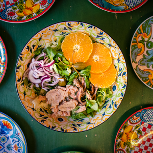 Lattuga, songino, filletto di tonno Angelo Parodi, capperi, arancia, acciughe, cipolla di Tropea