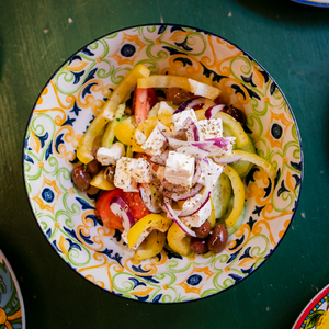 Pomodoro ramato, cetriolo, cipolla di Tropea, peperone giallo, olive taggiasche, origano feta