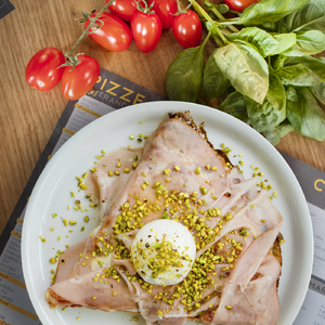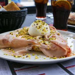 pomodoro, mozzarella, mortadella, burratina di Andria, granella di pistacchi